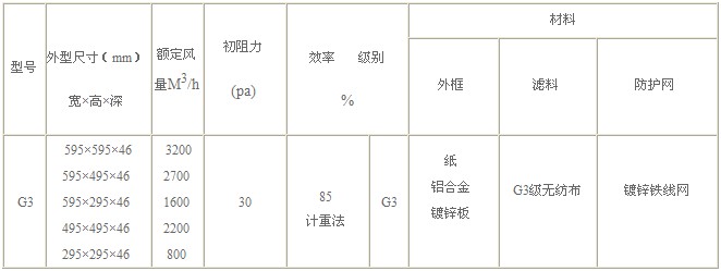G3級(jí)初效過濾器技術(shù)參數(shù):