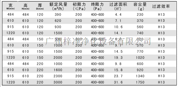 高效過濾器規格尺寸參數: